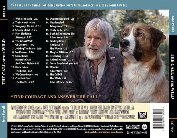 Premiere CD release of rousing John Powell score for 2020 filming of Jack London canine classic! Harrison Ford leads cast, Omar Sy, Dan Stevens, Karen Gillan, Bradley Whitford support, Michael Green scripts, Chris Sanders directs, 20th Century Studios presents. Intrada, in association with 5 Cat Studios, releases CD of terrific John Powell score which melds evocative outdoor settings with exciting canine action, all based on famed Jack London book from 1903. Klondike Gold Rush of the 1890’s serves as backdrop to story of Buck, an abducted dog undergoing numerous adventures as member of dog sled team delivering mail, becoming friend to John Thornton (Ford), ultimately hearing and succumbing to “the call of the wild”.