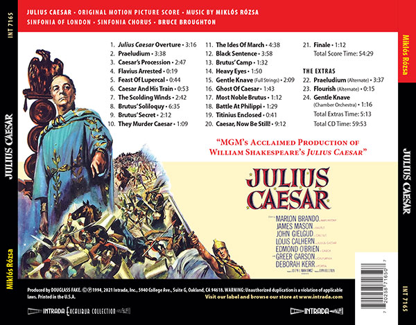 Newly remastered presentation of 1995 re-recording of Miklos Rozsa’s masterful score for Julius Caesar! Legendary Shakespeare telling of the events surrounding and following the assassination of the titular character saw production at MGM in 1953 under famed producer John Houseman, also-famed director Joseph L. Mankiewicz, with an equally famous cast that boasted Marlon Brando (Academy Award-nominated for Best Actor) plus James Mason, John Gielgud, Louis Calhern, Edmond O’Brien, Greer Carson, Deborah Kerr. Film was nominated for the Best Picture Oscar as well. Though Caesar is the catalyst for an intense tale of murder, intrigue and Roman warfare, it remains the towering figures of Caesar’s noble friend and Roman General, Mark Antony, in conflict with Caesar’s closest friend and eventual assassin, Brutus, that steers the drama.